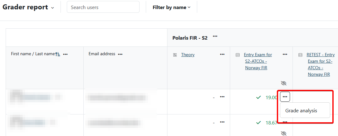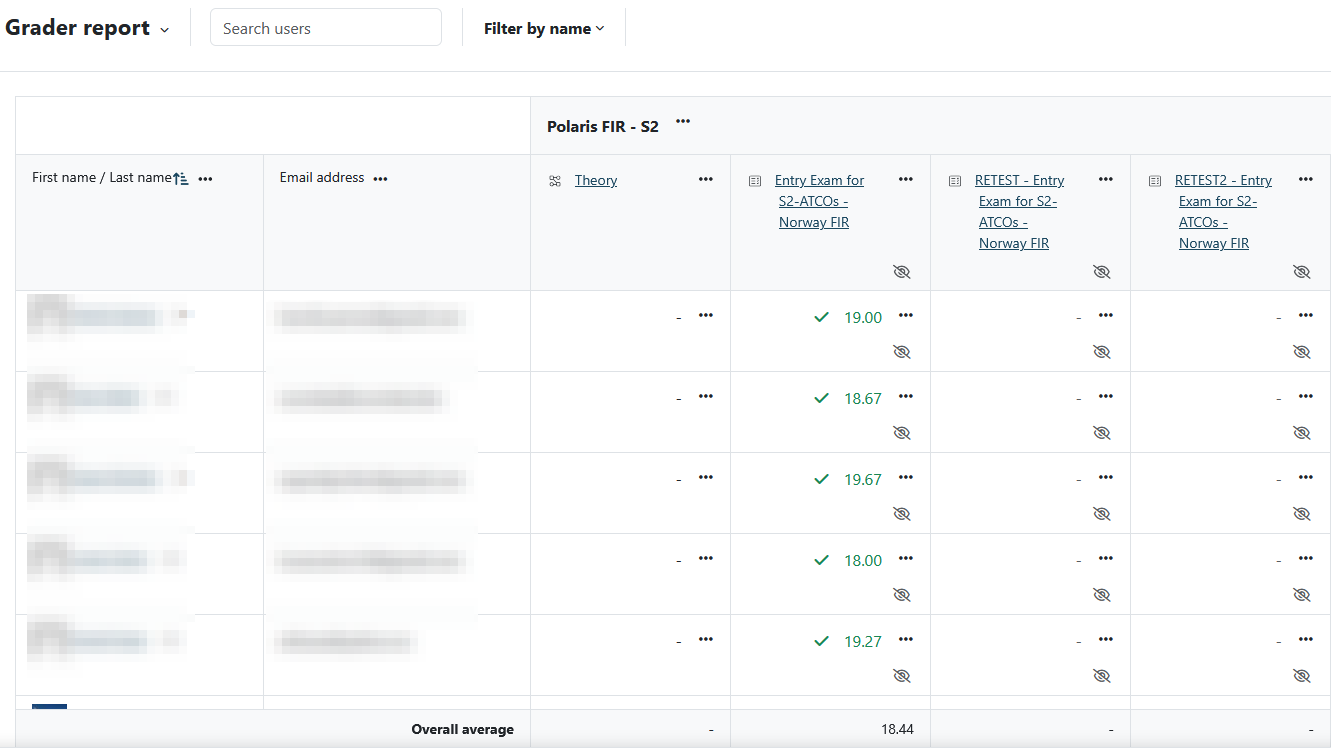 This will open the Grader report with an overview of all enrolled students and the overall result per module with grading.
