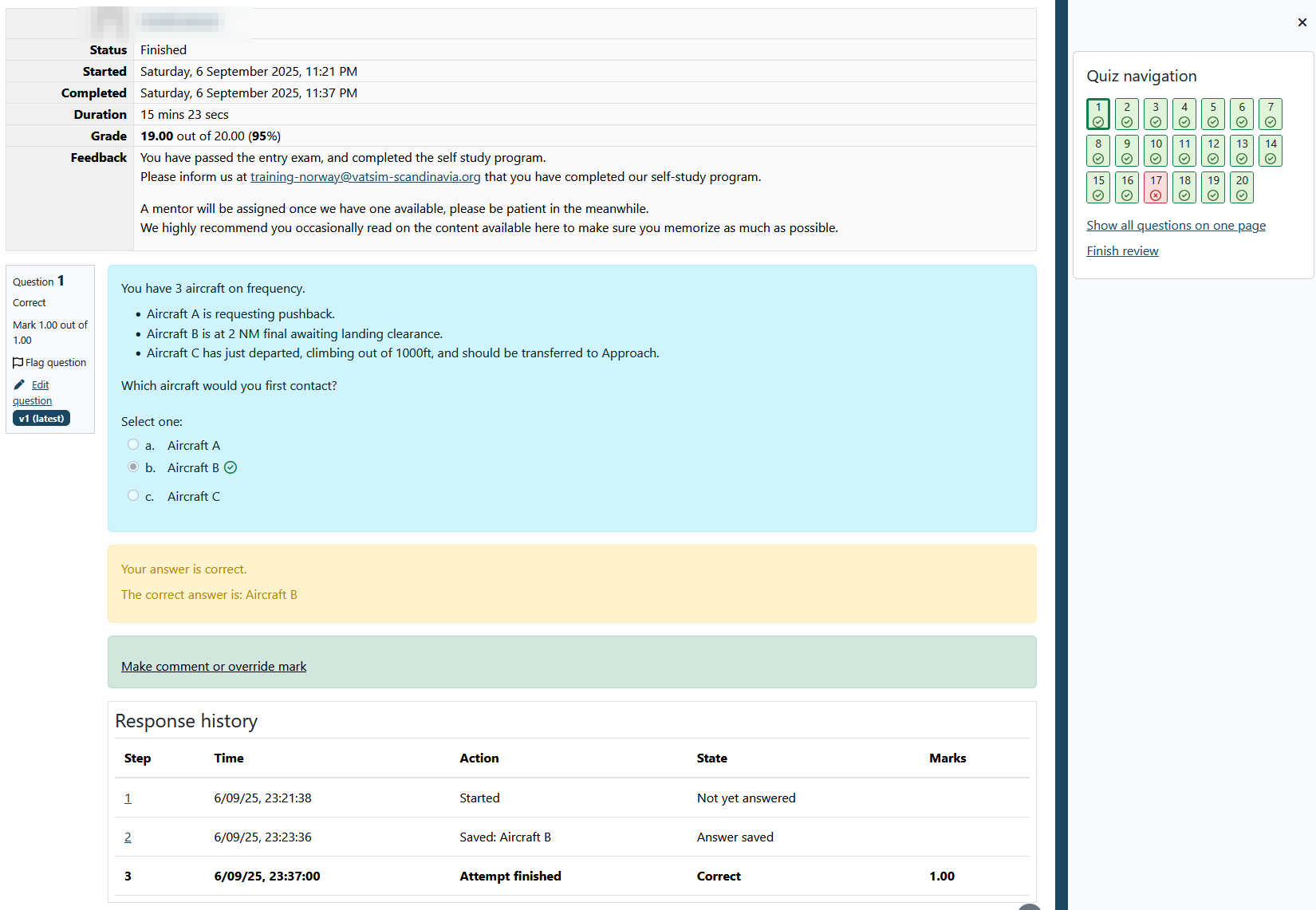 In Polaris FIR we are working on having one Moodle course per available training in CC. Each course has an entry exam that the student must pass in order to continue the training with a mentor. Students that don't manage to pass these entry exams will have their training closed, as their demonstrated competency isn't good enough to undergo further training.