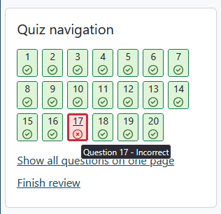 The Quiz navigation shows all questions and the result. Jumping to specific questions is possible by clicking on it.