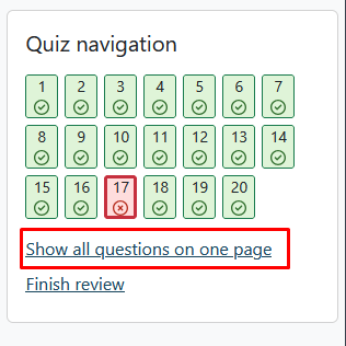 By default questions are shown one by one. Clicking "Show all questions on one page" will allow you to scroll through the entire quiz.