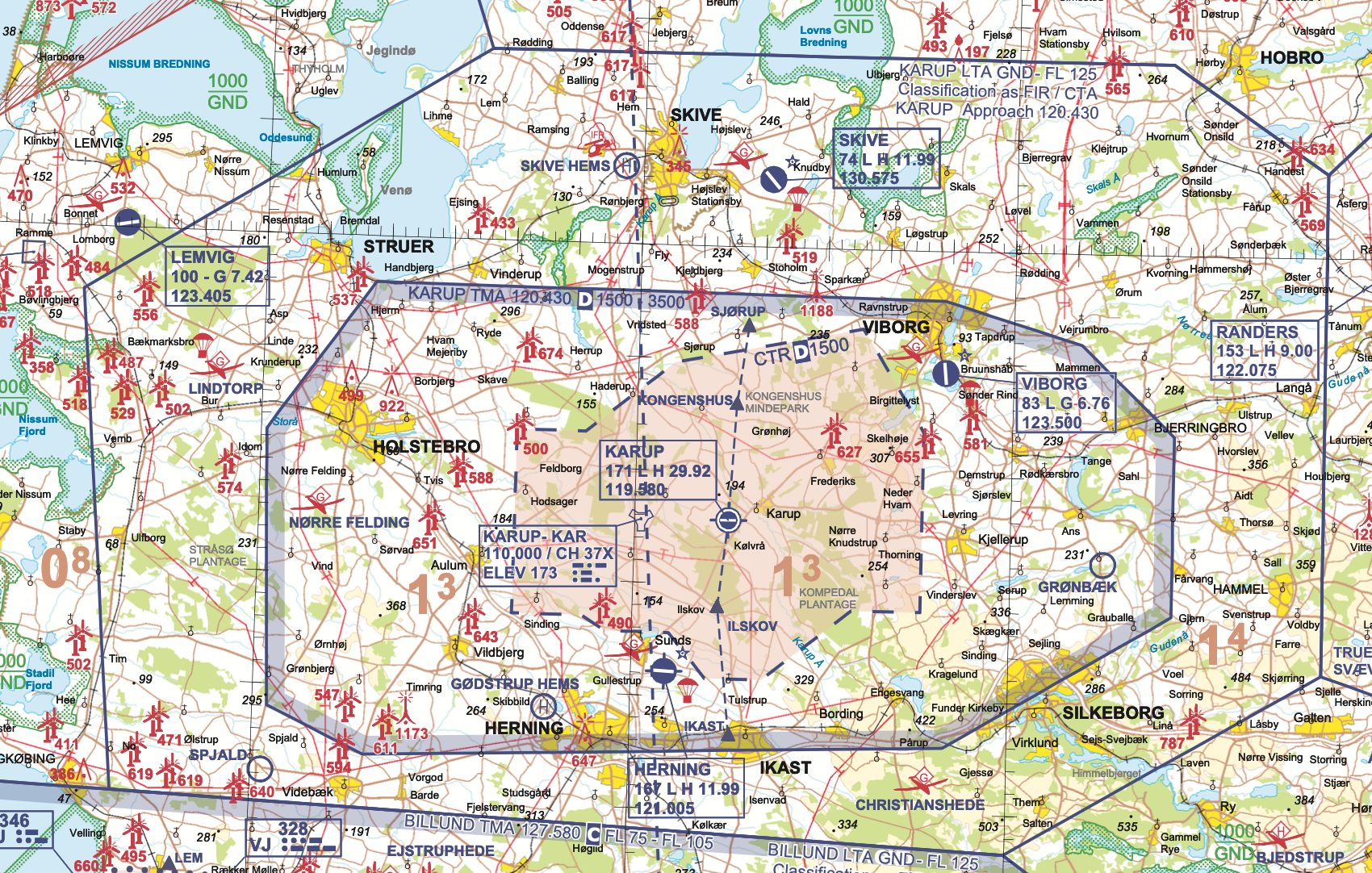 Karup Midtjylland Airport, The airport is situated 3 km west of Karup and carries passengers primarily from nine municipalities in mid- and west.The civilian airport uses the runways of Air Base Karup, the primary base of the Royal Danish Air Force. Karup handles mostly domestic flights, and a few charter flights.