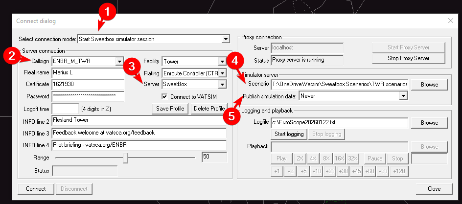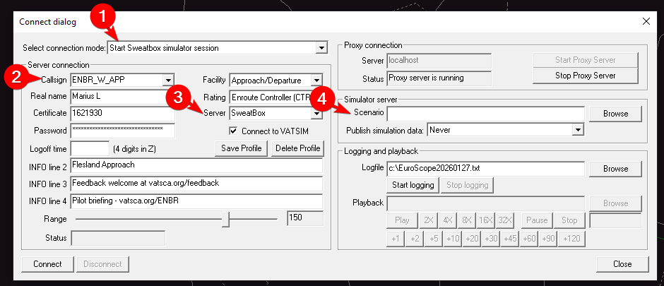 Connecting to sweatbox as a student is very simple. They log on exactly as they would on the network with the correct callsign for the position they will control, but the only exception is changing "Server" to either Sweatbox or the address for server 2 if used.